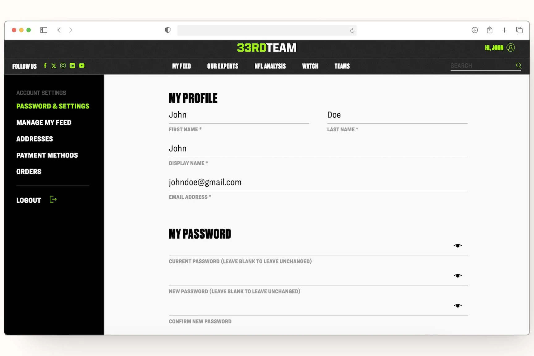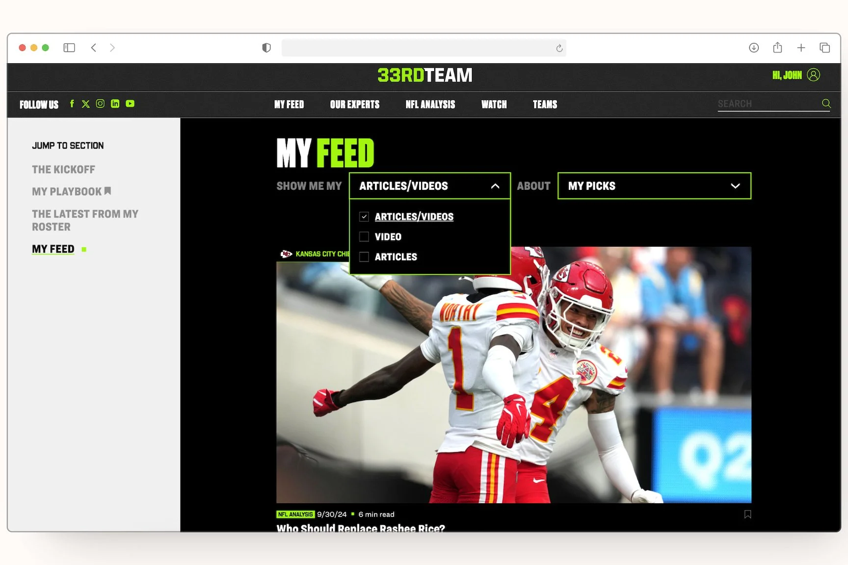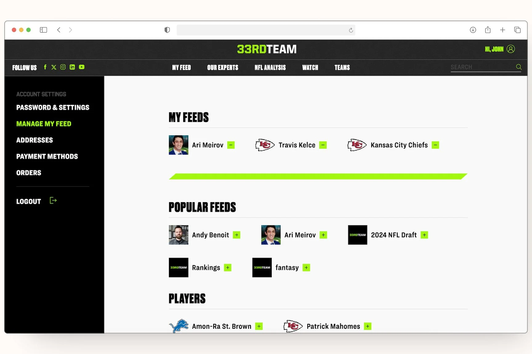 After the initial launch of the site, we launched Phase 2 where I designed a subscriber-specific feed, along with account settings and features tailored to the individual. When users subscribe to The 33rd Team, they can effortlessly manage their account settings and access personalized content that aligns with their interests.