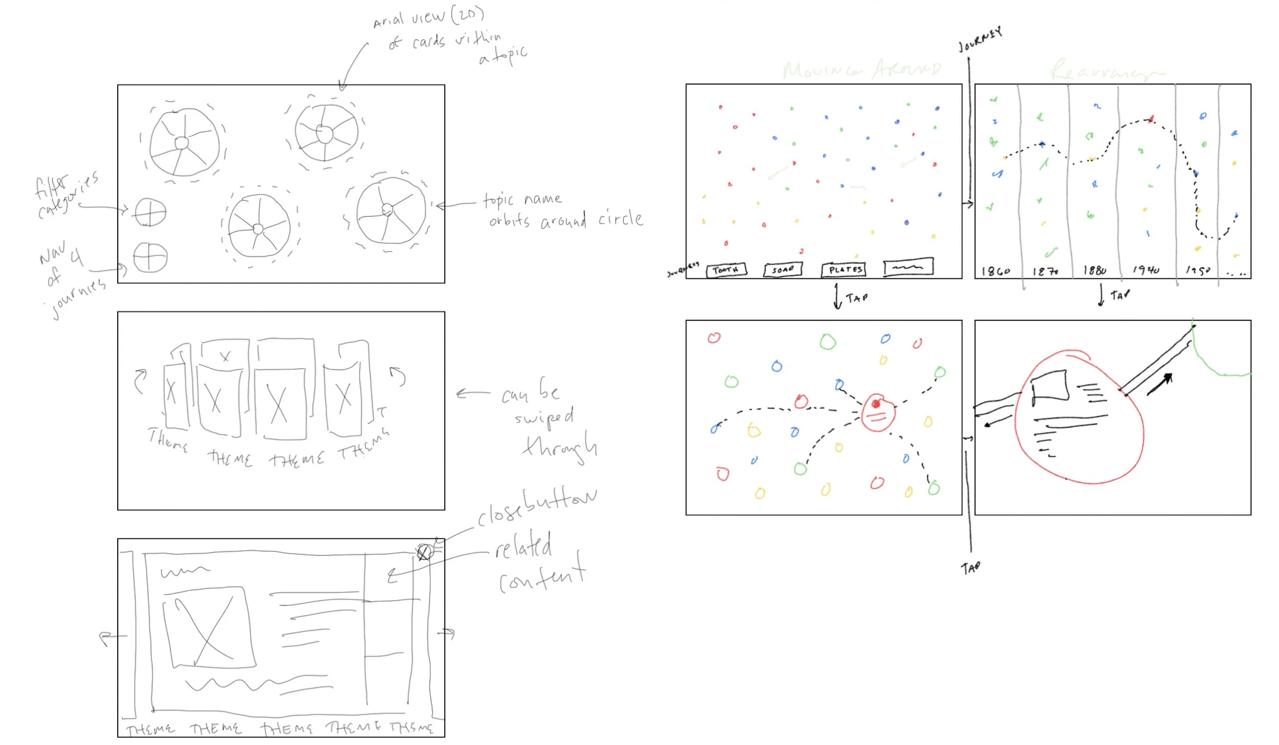 I opted to go with a vertical layout for the content rows, taking into consideration the user's height and ease of accessing all the content bubbles. We tested various touchscreens from museums and concluded that simpler triggers and gestures would make for a better experience.