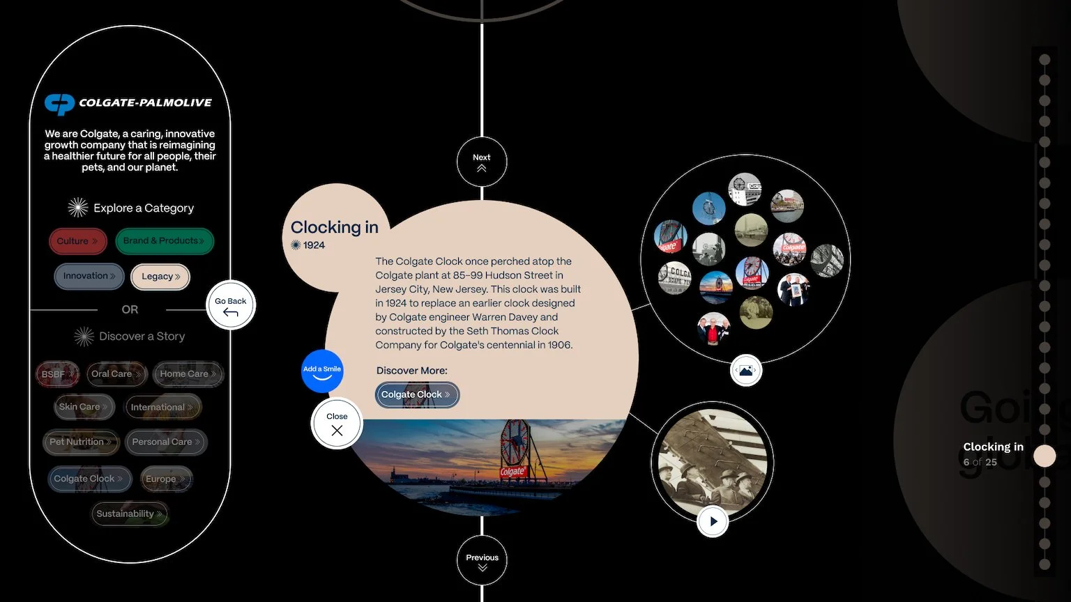 Through a well-crafted narrative structure and intuitive design, my team and produced an engaging and delightful interactive experience. Our approach offered a range of potential user journeys, deepening the connection and understanding between Colgate Palmolive, its visitors, and employees.