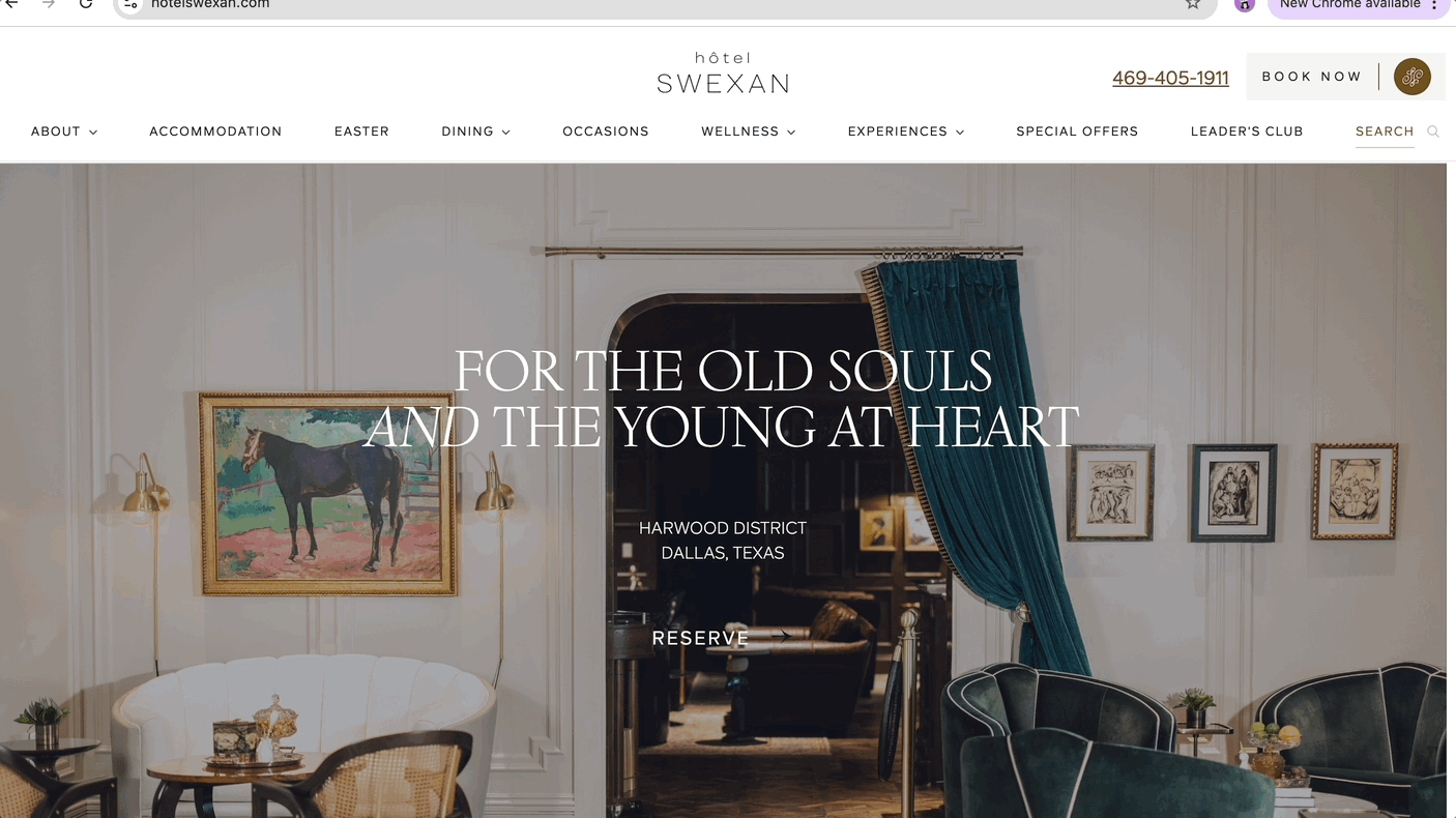 Create a digital platform that represents the brand identity and mission of Hotel Swexan, positioning the new build as a premier destination in Dallas, Texas.